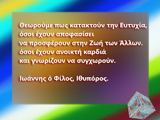 Να λέμε και να γράφουμε την γνώμη μας διαρκώς, για την πρόοδο της Ελλάδας και του Ελληνικού Λαού. Πιο πάνω από κόμματα και ιδεολογίες, που καλώς υπάρχουν προκειμένου να συνθέτουν λύσεις, αλλά κακώς να κρατούν τον Λαό διχασμένο εξ αφορμής λαθών και παραλήψεων περασμένων δεκαετιών.