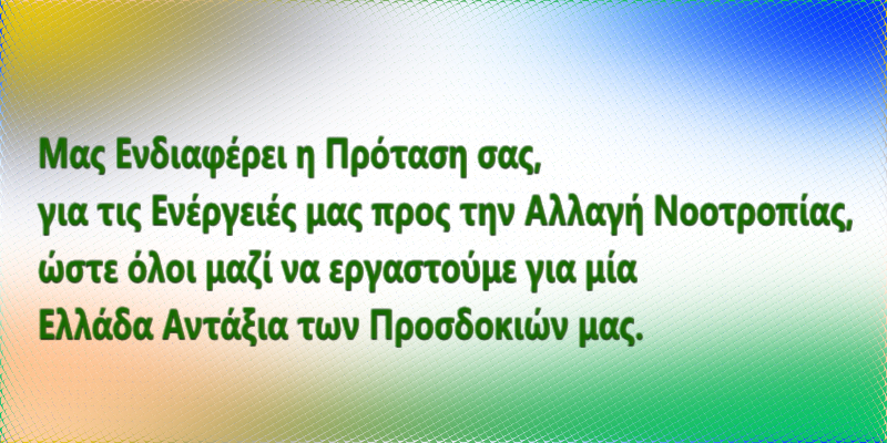 Μας Ενδιαφέρει η Πρόταση σας, για τις Ενέργειές μας προς την Αλλαγή Νοοτροπίας, ώστε όλοι μαζί να εργαστούμε για μία Ελλάδα Αντάξια των Προσδοκιών μας.