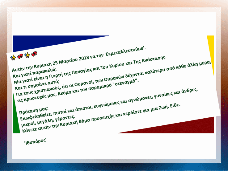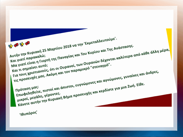 Αυτήν την Κυριακή 25 Μαρτίου 2018, να την ‘Εκμεταλλευτούμε’.