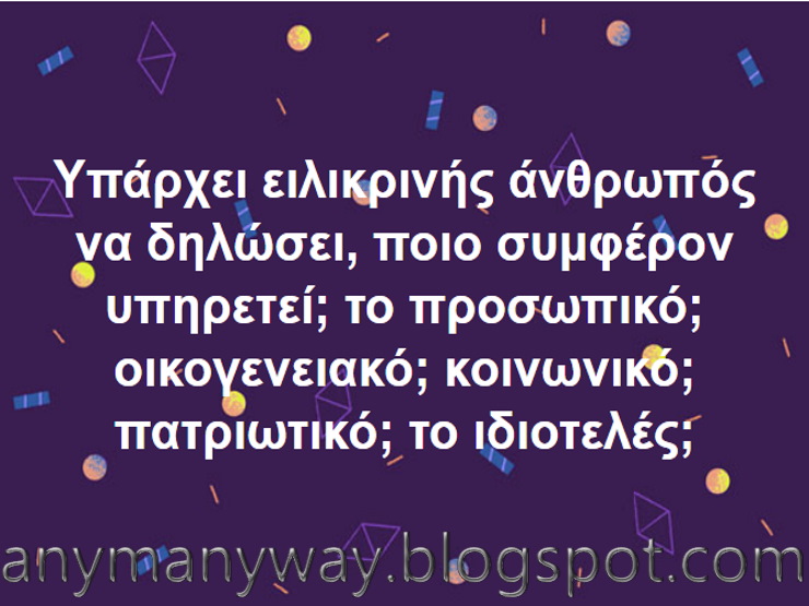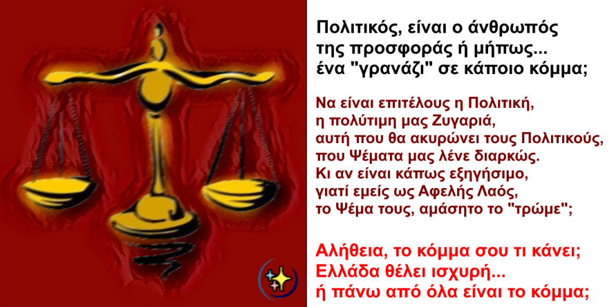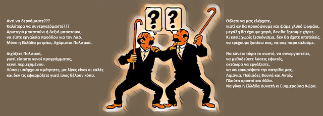 Οι Πολιτικοί, οφείλουν να εργάζονται για την διακυβέρνηση της Ελλάδας και όχι για την εξουσία επί της Ελλάδας. Πρέπει να υπάρχει σεβασμός στο λειτούργημα της “πολιτικής”. Και η ανταμοιβή των πολιτικών να είναι καθημερινή, όπως άλλωστε και η λογοδοσία τους.